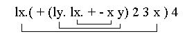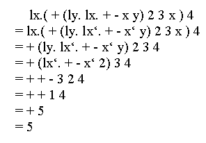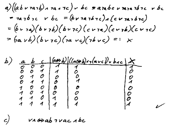 b) |||*|| -(8)-> a||*|| -(1)-> |a|*|| -(1)-> ||a*|| -(2)-> ||*b|| -(3)-> ||*cb| -(3)-> ||*|c|cb -(4)-> ||*|c|c -(5)-> ||*||cc -(8)-> a|*||cc -(1)-> |a*||cc -(2)-> |*b||cc -(3)-> |*|cb|cc -(3)-> |*|c|cbcc -(4)-> |*|c|ccc -(5)-> |*||cccc -(8)-> a*||cccc -(2)-> *b||cccc -(3)-> *|cb|cccc -(3)-> *|c|cbcccc -(4)-> *|c|ccccc -(5)-> *||cccccc -(8)-> *a|cccccc -(1)-> *|acccccc -(10)-> *|cccccc -(8)-> *acccccc -(10)-> *cccccc -(9)-> dcccccc -(6)-> |dccccc -(6)-> ||dcccc -(6)-> |||dccc -(6)-> ||||dcc -(6)-> |||||dc -(6)-> ||||||d -(7)->. |||||| 2) Grammatik a) Die Grammatik ist CH-3. b) Die erzeugte Sprache lautet L = { a* { b c* }* a } c) ![]() 3) Grammatik G:= ( {S, B, W}, {a,b}, S, P) P:= { S -> aSW | B, B -> bBW | bW, W -> a | b } Es gibt keine reguläre Grammatik, die diese Sprache erzeugt. 4) Boolsche Algebra ![]() 5) Algebra a) Get(Ins(Del(Ins(Ins(create,1),2)),3)) (A2) = Get(Ins(Ins(Del(Ins(create,1),2)),3)) (A1) = Get(Ins(Ins(create,2),3)) (A4) = Get(Ins(create,2)) (A3) = 2 b) Get(Ins(Ins(Del(Ins(create,3)),4),Get(Ins(Ins(create,5),6)))) (A1,A4) = Get(Ins(Ins(create,4),Get(Ins(create,5)))) (A3) = Get(Ins(Ins(create,4),5)) (A4) = Get(Ins(create,4)) (A3) = 4 6) Lambda-Kalkül a) ![]() b) ![]() |